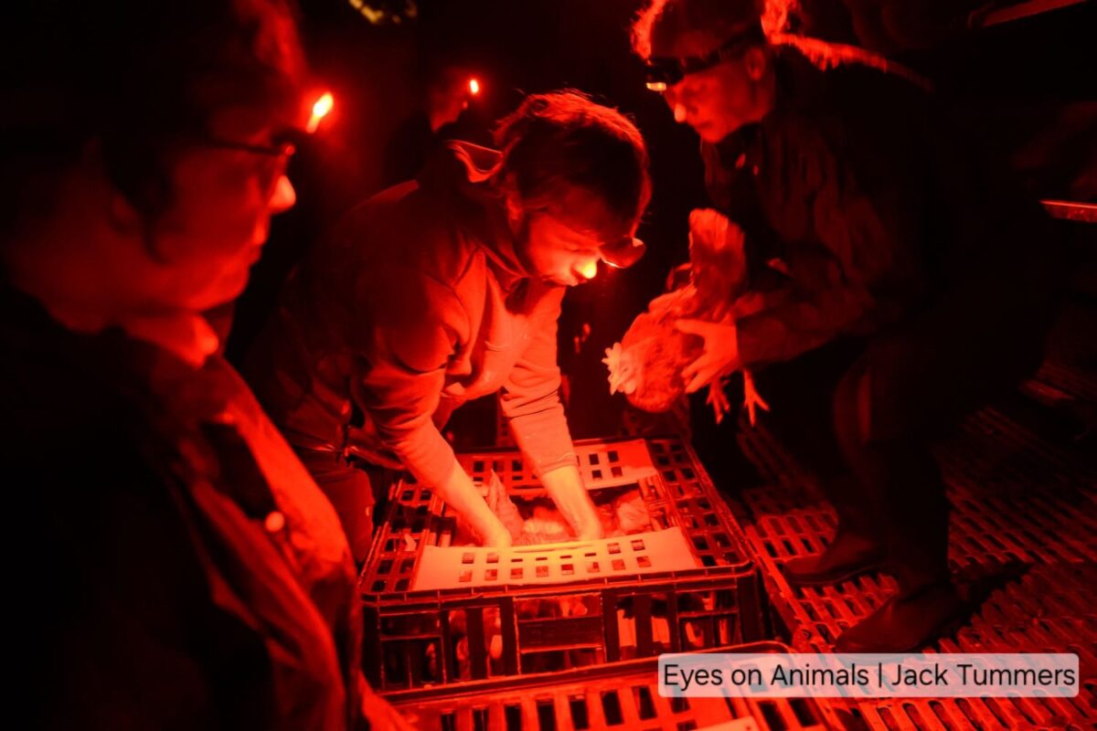 Vanavond hielp een team van Eyes on Animals bij het vangen en laden van de kippen bij Demeter-pluimveehouder De Dennenhoeve. Deze pluimveehouder was een van de eersten die stopte met de gangbare methode, waarbij kippen ondersteboven aan één poot worden opgetild. Al zeven jaar geleden stapten zij over op de rechtop-vangmethode van Eyes on Animals. Als blijk van waardering hielpen we met acht mensen mee om de kippen op een zo respectvolle manier rechtop te vangen. In totaal werden er 2700 kippen gevangen in ongeveer 1,5 uur.